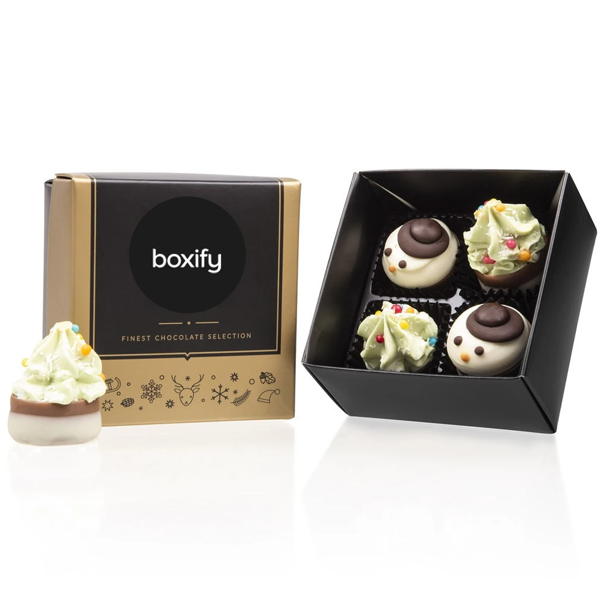 Gift box with 4 fun Christmas chocolates to surprise the sweet-toothed. Personalize it with your logo on a full-color label and surprise from the stomach!