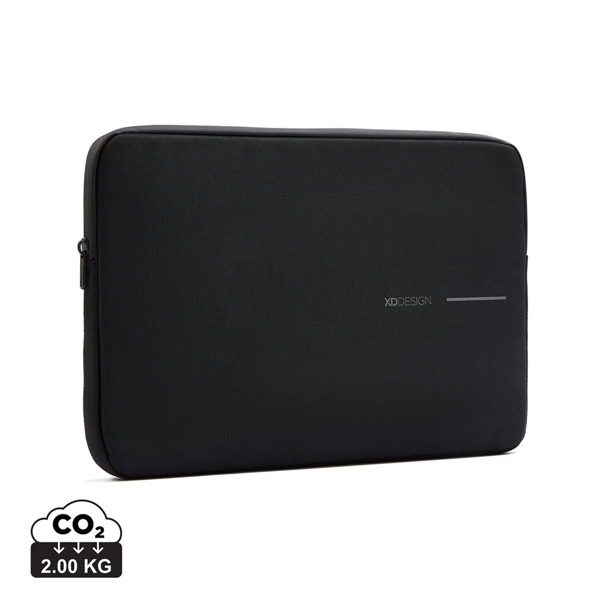 The 14" laptop sleeve by XD Design in classic black offers reliable protection for your computer. Precision crafted with 1200D rPET fabric with a water repellent finish and a cool gray fleece lining, it reinforces your device against everyday elements. The waterproof zipper improves resistance. Made with environmental responsibility in mind, it is made from genuine recycled fabric materials. Crafted with R-pet fabric with AWARE™ tracer. With AWARE™, the use of genuine recycled fabric is guaranteed. Recycled content 22%.