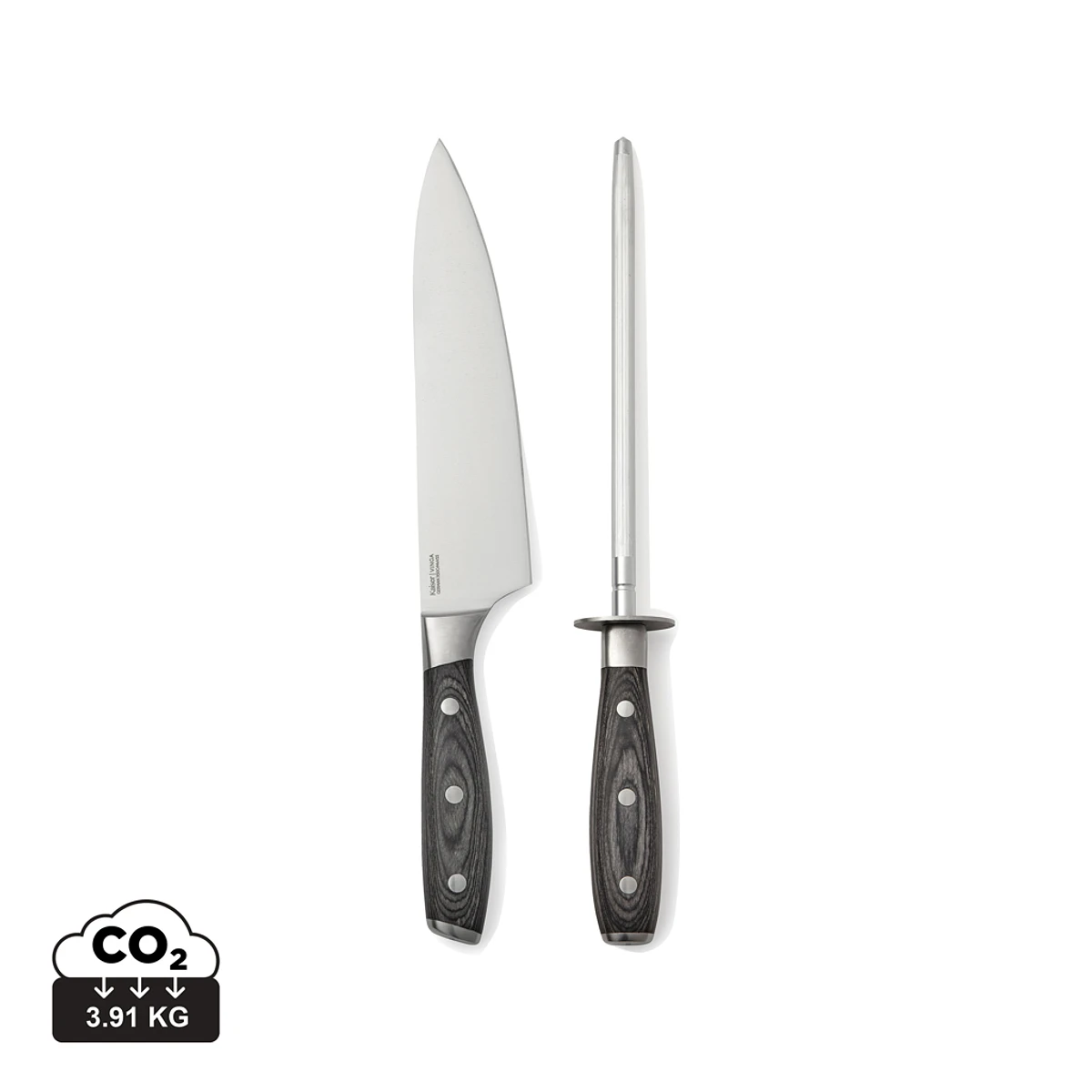 Chef's knife and sharpener from the Kaiser range. The knife is made from German X50CrMoV15 steel and the handle is made of Pakka wood. The easy-grip handle and excellent balance of the blade make the knife comfortable and easy to work with. The inherent properties of German steel make the blade stain resistant and require no more care than occasional sharpening. Chef's knife: 20 cm blade. Sharpening steel: 33 cm.