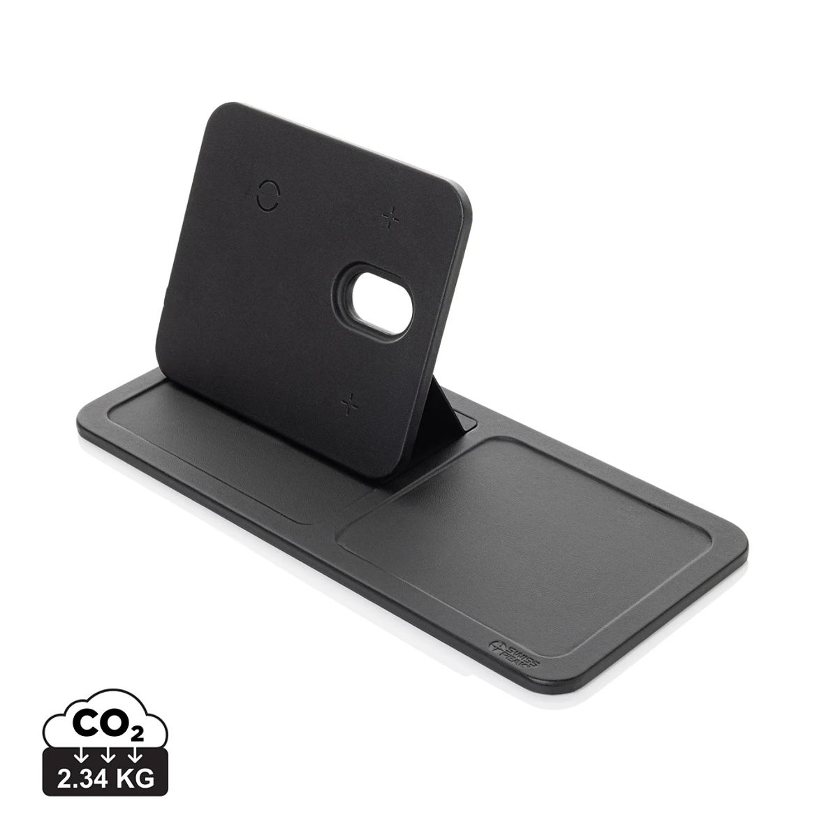 Cargador inalámbrico 3 en 1 de lujo y plegable con bandeja de escritorio fabricado con PU reciclado RCS. Contenido reciclado total: 5% en base al peso total del artículo. La certificación RCS garantiza una cadena de suministro completamente certificada de los materiales reciclados. Equipado con un cargador inalámbrico magnético de 15W y un cargador inalámbrico adicional de 5W adecuado para estuches de auriculares u otros dispositivos pequeños de carga inalámbrica. Cargador inalámbrico de 2,5 W para relojes inteligentes (solo relojes Apple). Incluye cable TPE de 120 cm. Presentado en embalaje mixto FSC®. Artículo y accesorios 100% libres de PVC. Entrada mínima: 9 V/3 A para un uso óptimo. Salida: Teléfono: 9 V/1,1 A; 9 V/1,67 A/(15 W), Auriculares: 5 V/1 A (5 W), Reloj: 5 V/0,5 A.