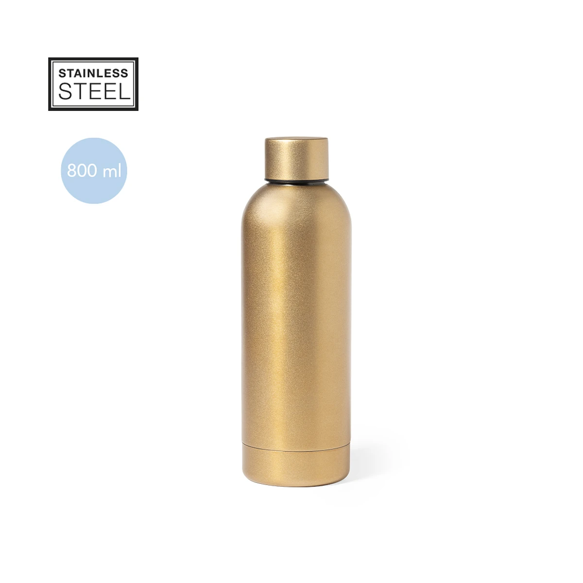 Bidón de acero inox de 800 ml de capacidad, disponible en variada gama de colores metalizados de acabado mate. Presentado en atractiva caja de diseño.