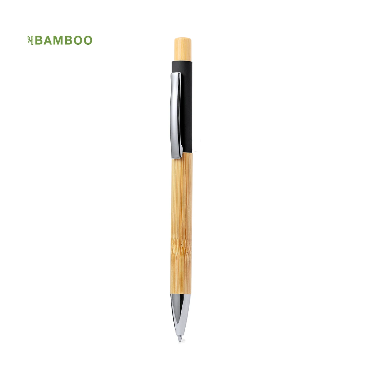 Elegante bolígrafo fabricado en bambú. Cuerpo en resistente aluminio de acabado goma y empuñadura en bambú, con la caña en una amplia gama de distintivos colores. Clip metálico, con mecanismo pulsador y en tinta azul. Presentado en bolsa individual reciclada.Materiales como el bambú fomentan la utilización de materias primas naturales, reduciendo las emisiones contaminantes. Proviene de una planta de gran resistencia y versatilidad, con crecimiento y regeneración rápidos, siendo una excelente alternativa al uso de madera tradicional.