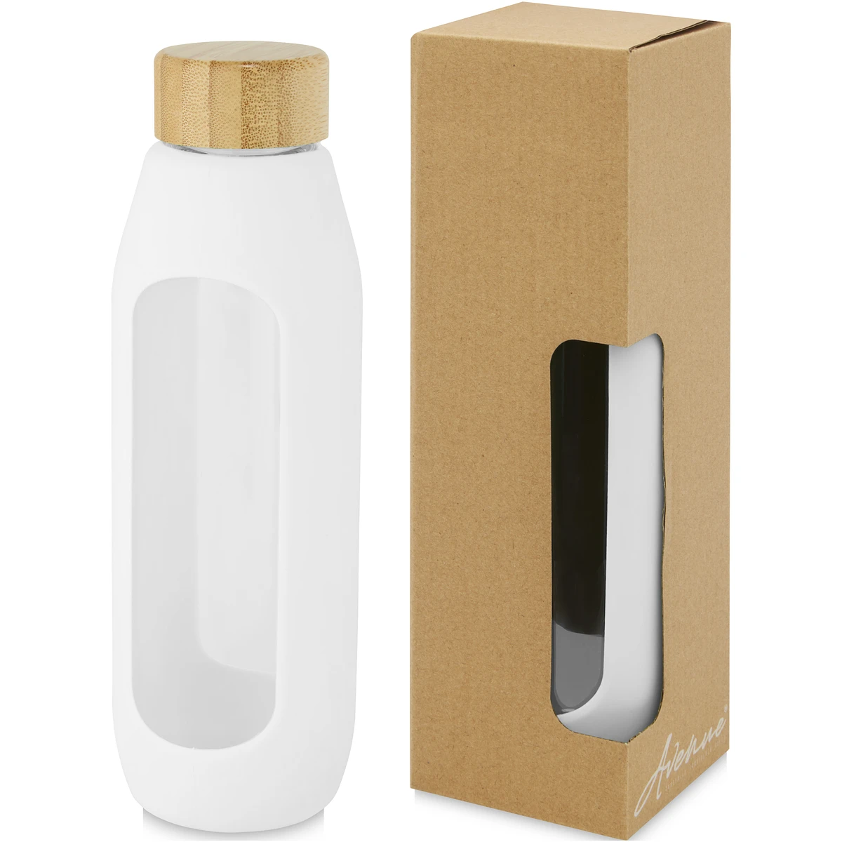 Botella de agua ecológica y reutilizable que proporciona una experiencia de consumo de agua pura. La botella está hecha de vidrio borosilicato resistente que conserva el sabor puro y fresco del agua, y no contiene productos químicos nocivos. Tiene un agarre de silicona con una tapa hermética hecha de bambú orgánico. Probado y homologado conforme a la legislación alemana sobre seguridad alimentaria (LFGB), y comprobado el contenido de ftalatos según la normativa REACH. Capacidad de 600 ml. Al retirar el agarre y la tapa, la botella se puede lavar en el lavavajillas. Se presenta en una caja de regalo de cartón reciclado.
