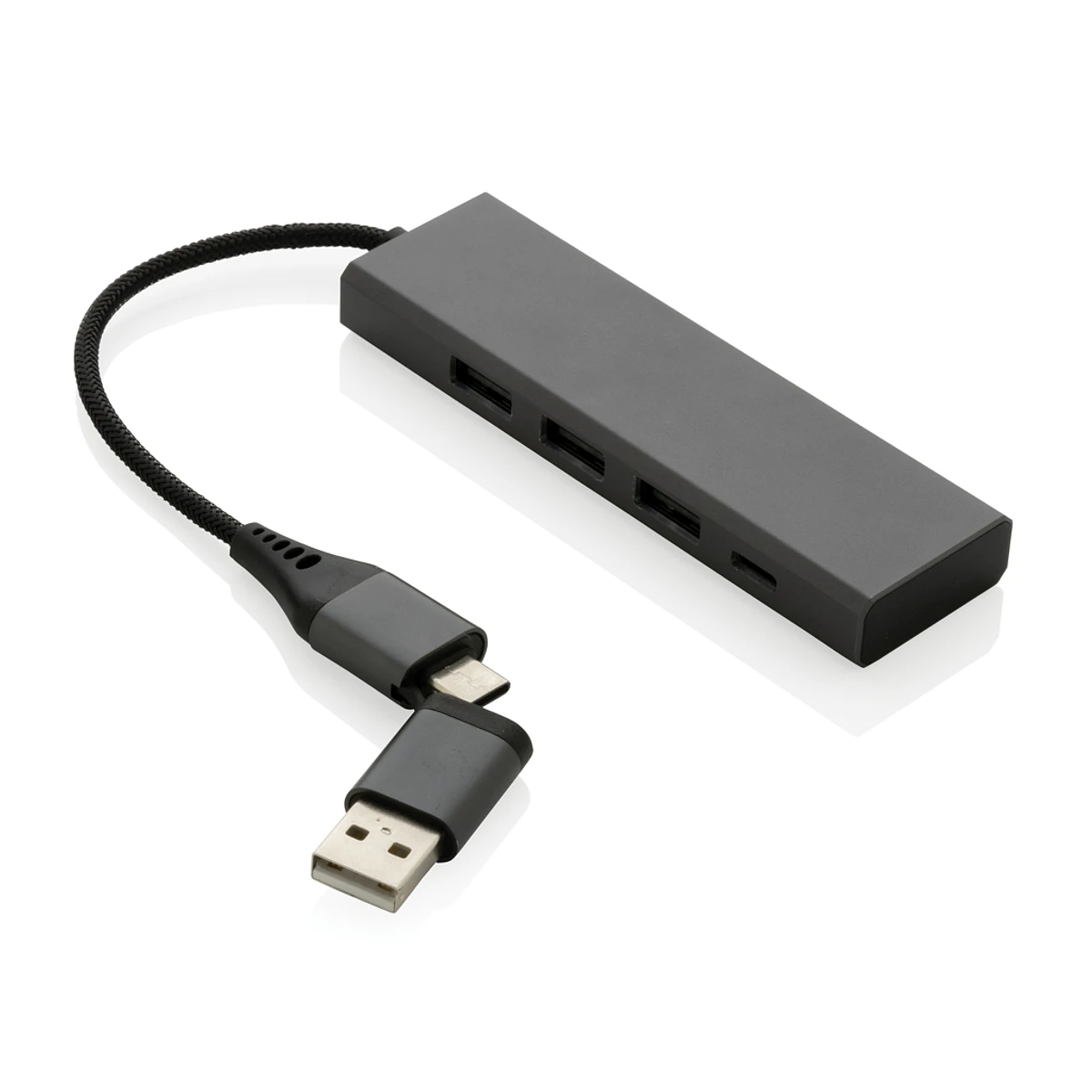 Hub USB fabricado con aluminio reciclado certificado RCS (Recycled Claim Standard), ABS, TPE y PET. Con 3 puertos USB A 2.0 y 1 puerto tipo C. El HUB tiene un cable integrado de 10 cm hecho de material reciclado TPE/PET certificado por RCS. Contenido reciclado total: 75% basado en el peso total del artículo. La certificación RCS garantiza una cadena de suministro completamente certificada de los materiales reciclados. Con conector de entrada dual por lo que es apto tanto para ordenadores tipo C como USB A. El aluminio no pierde sus características en el proceso de reciclaje y puede reciclarse infinitamente. Artículo y accesorios 100% libres de PVC. Presentado en embalaje mixto FSC. Permite transferencia de datos.