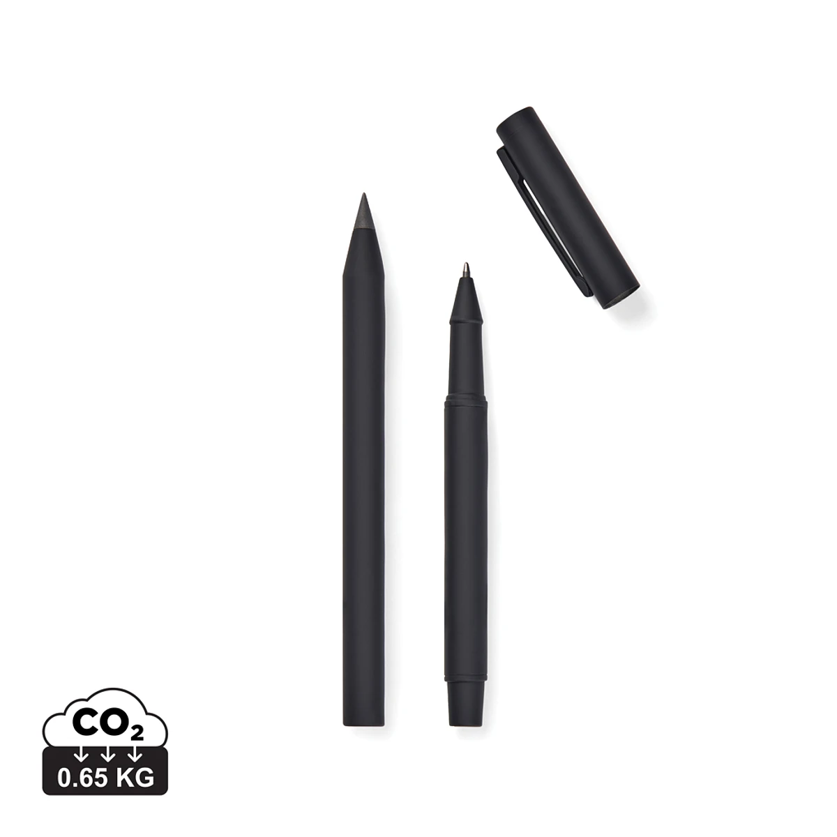 Este moderno y elegante set incluye dos bolígrafos: un bolígrafo Eternal y un bolígrafo clásico con capuchón y clip. Diseñados tanto para el estilo como para la funcionalidad, estos bolígrafos están fabricados con acero inoxidable reciclado con certificación RCS, con un revestimiento de superficie de goma para un agarre cómodo y un acabado mate. Ambos bolígrafos tienen un peso equilibrado que garantiza la estabilidad y una escritura sin esfuerzo. El bolígrafo Eternal ofrece una escritura sin límites. El bolígrafo tiene una punta fina de 1,00 mm y proporciona una escritura suave y uniforme con tinta azul documental, que dura hasta 1200 metros. Certificada por RCS (Recycled Claim Standard), la certificación RCS garantiza que toda la cadena de suministro de materiales reciclados está certificada. El contenido reciclado total se basa en el peso total del producto. Este producto contiene un 52% de aluminio reciclado certificado por RCS y un 10% de acero inoxidable certificado por RCS.