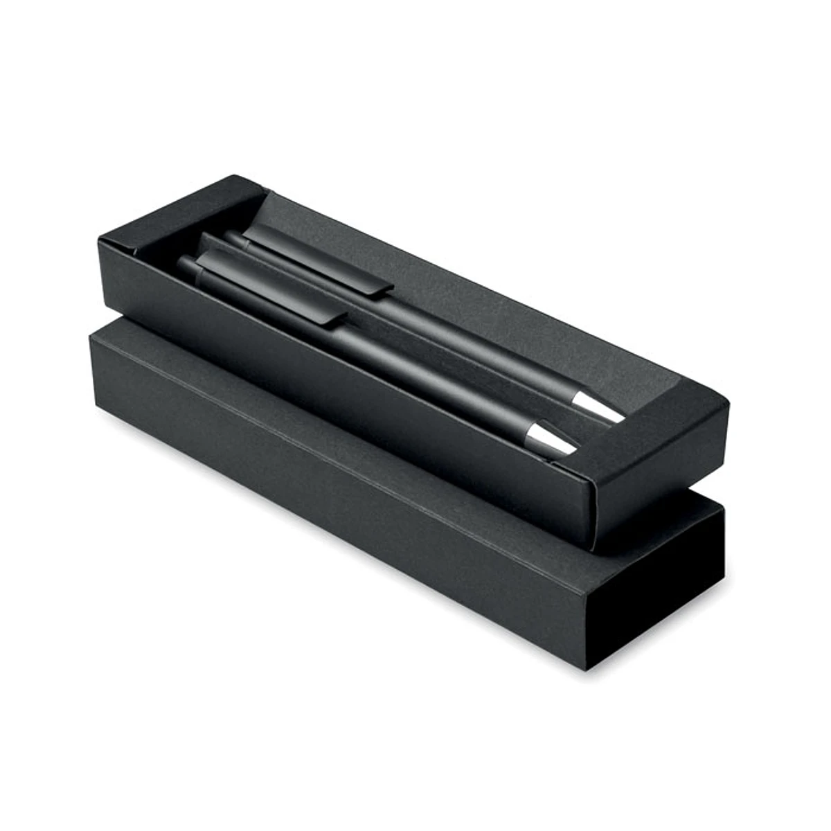 Set de bolígrafo de aluminio reciclado con 1 bolígrafo de pulsador y 1 bolígrafo de grafito sin tinta. Tinta azul. Presentado en caja de papel reciclado.