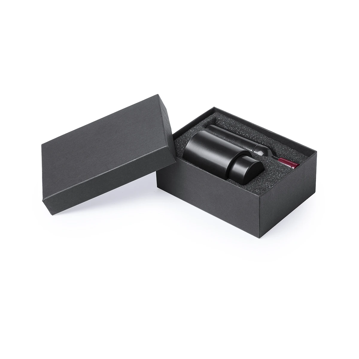 Original set de vinos con sacacorchos en forma de botella de vino y tapón con bomba de vacío. Presentado en estuche individual de cartón negro con interior en suave espuma troquelada.