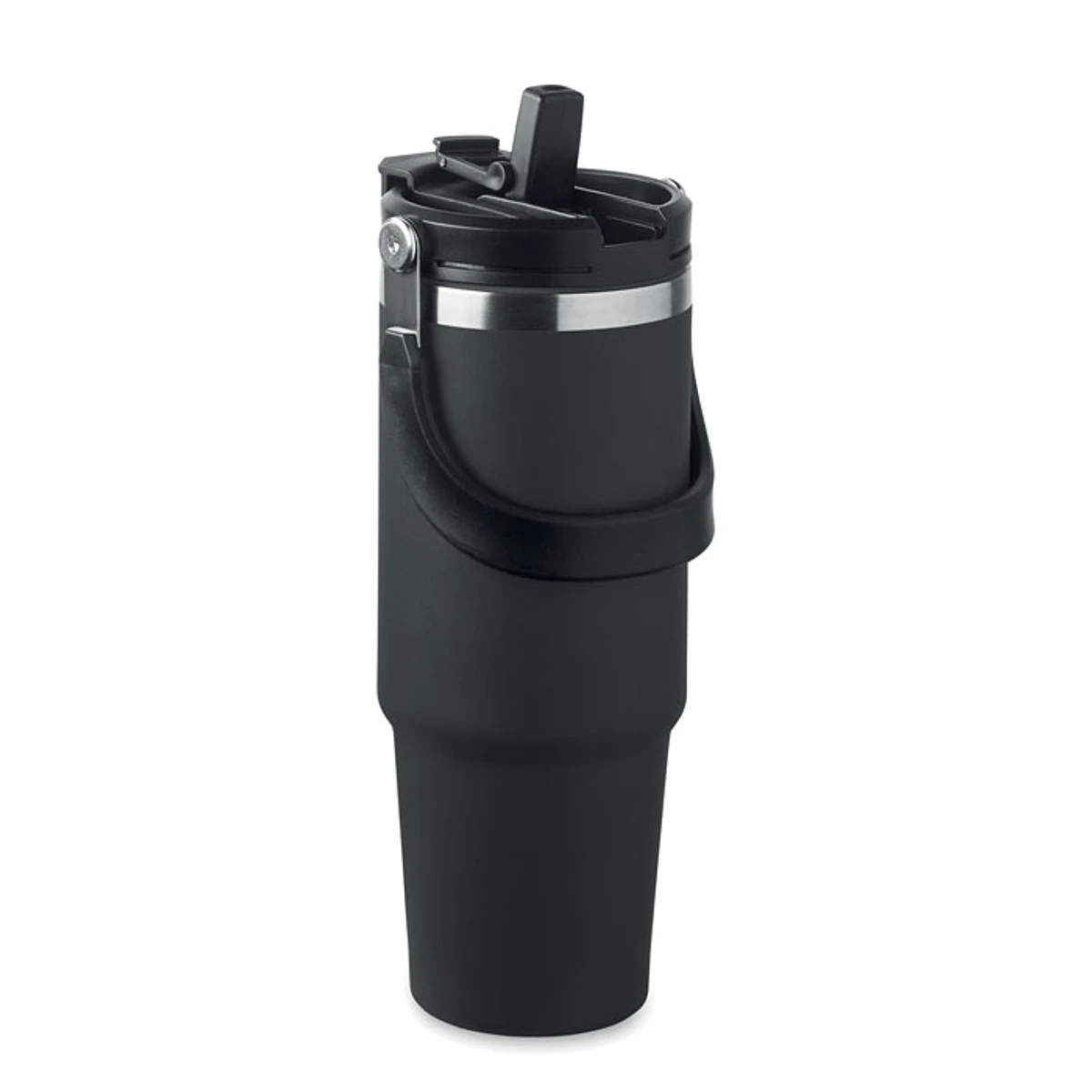 Vaso de acero inoxidable reciclado de doble pared (90% de acero inoxidable reciclado y 10% de acero inoxidable) con tapa y pajita interior, boquilla plegable y abertura directa para beber . Capacidad 850 ml.