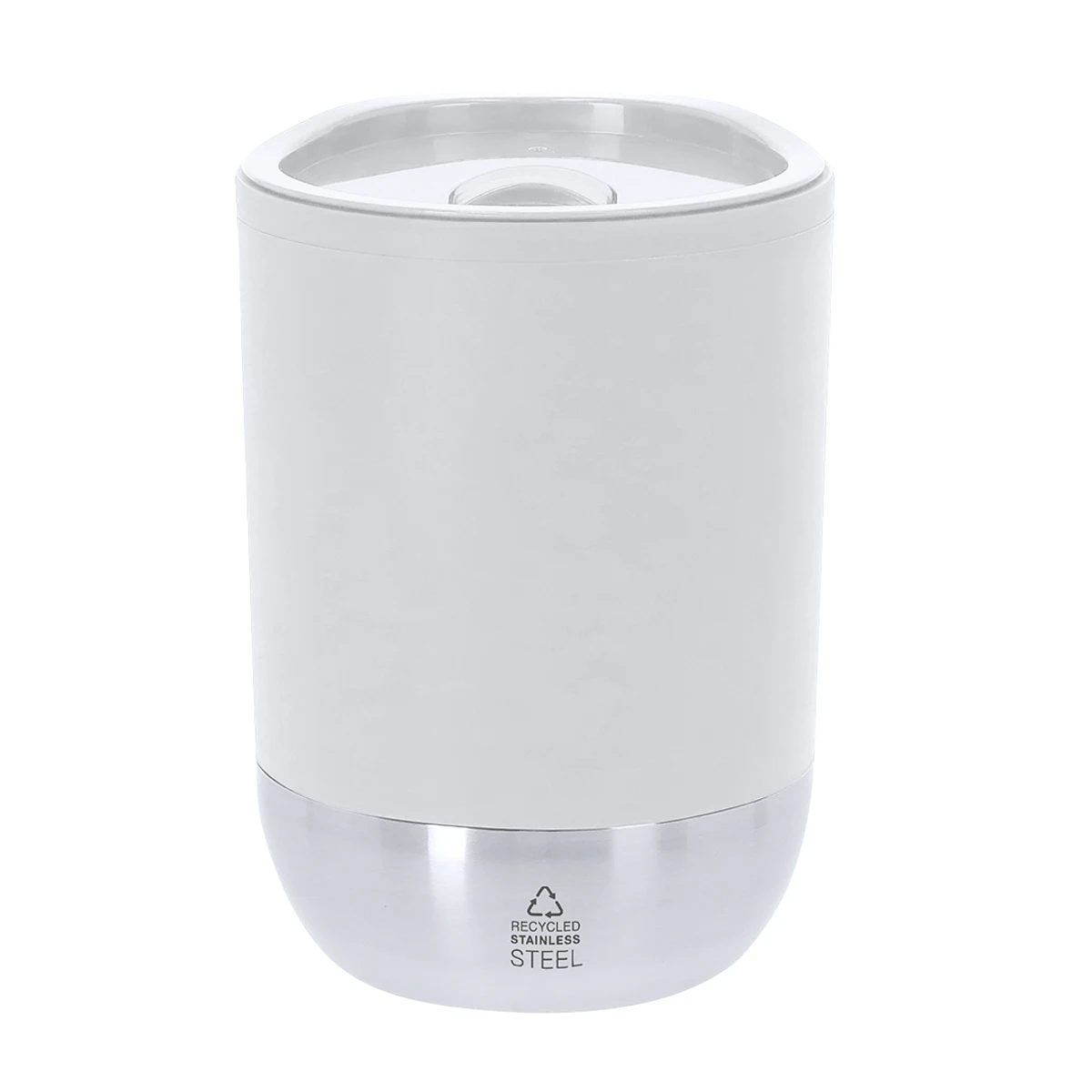 Vaso térmico de 290 ml de capacidad. Fabricado en resistente PP Reciclado de doble pared en combinación con base en Acero Inox Reciclado. Tapa con dosificador de fácil apertura, libre de BPA. Es ideal para tener en tu escritorio, mesa o en cualquier superficie donde disfrutar tranquilamente de tu bebida favorita. Con certificación Food Grade, garantizando la seguridad cuando los alimentos entran en contacto con el material usado para fabricar el producto. Con distintivo de Acero Inox Reciclado. El PP reciclado es un plástico reciclado y altamente reciclable, de gran resistencia y apto para multitud de aplicaciones.El acero es uno de los materiales más demandados y que puede encontrarse casi en todas partes, desde productos de uso diario a grandes construcciones. Con innumerables propiedades, entre las que cabe destacar la durabilidad y su alto grado de reutilización, convirtiéndolo en una alternativa muy valorada en soluciones de sostenibilidad. Debidamente tratado, permite obtener nuevos recursos de infinita utilización.
