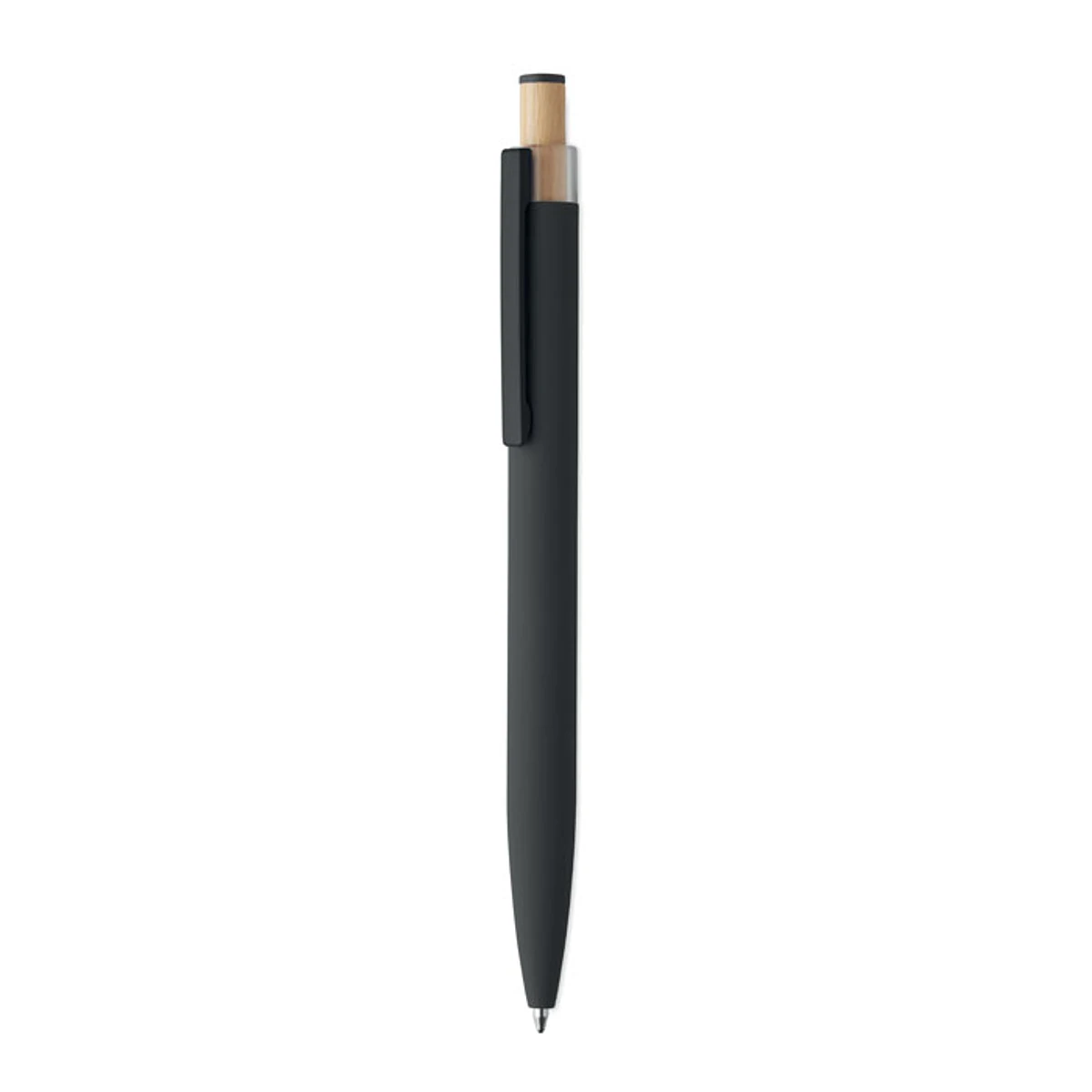 Bolígrafo de aluminio reciclado con pulsador de bambú con detalle de color a juego y clip metálico a juego. Tinta azul.