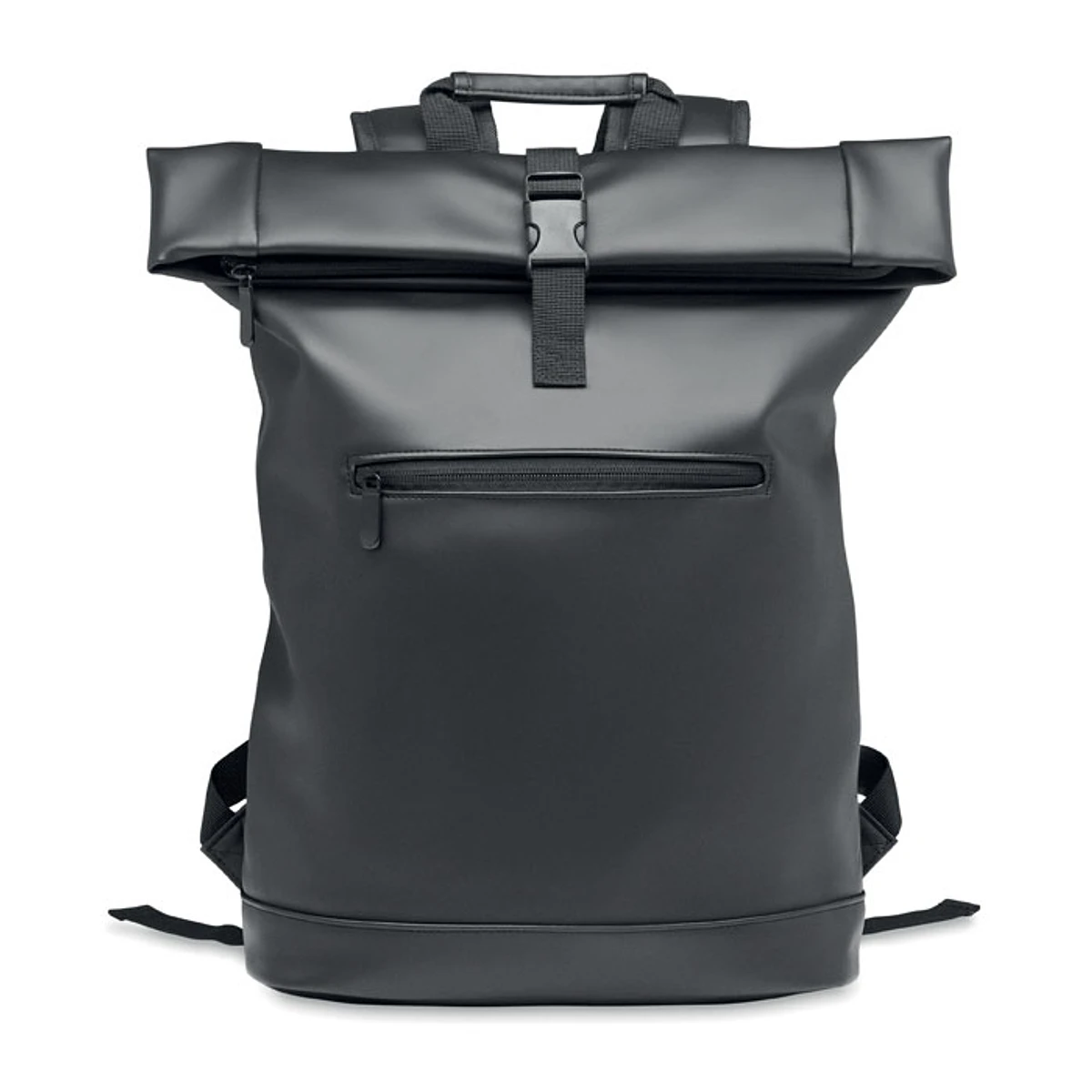 Mochila roll top para portátil de 15'''' en suave PU con respaldo acolchado y base reforzada. Gran bolsillo frontal con cremallera. El forro es de RPET 210D.